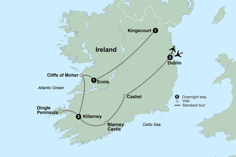 Depart Dublin for Ireland’s breathtaking countryside. Visit the town of Cashel for views of the historic Rock of Cashel, the location where it’s believed St. Patrick preached and converted the king of Munster. Next, journey to historic Blarney Castle, where you may take the opportunity to kiss the famous Blarney Stone. Legend has it that those who kiss the stone are bestowed with the gift of eloquence. End your day in Killarney, a town surrounded by natural beauty. Enjoy dinner this evening at a local restaurant.